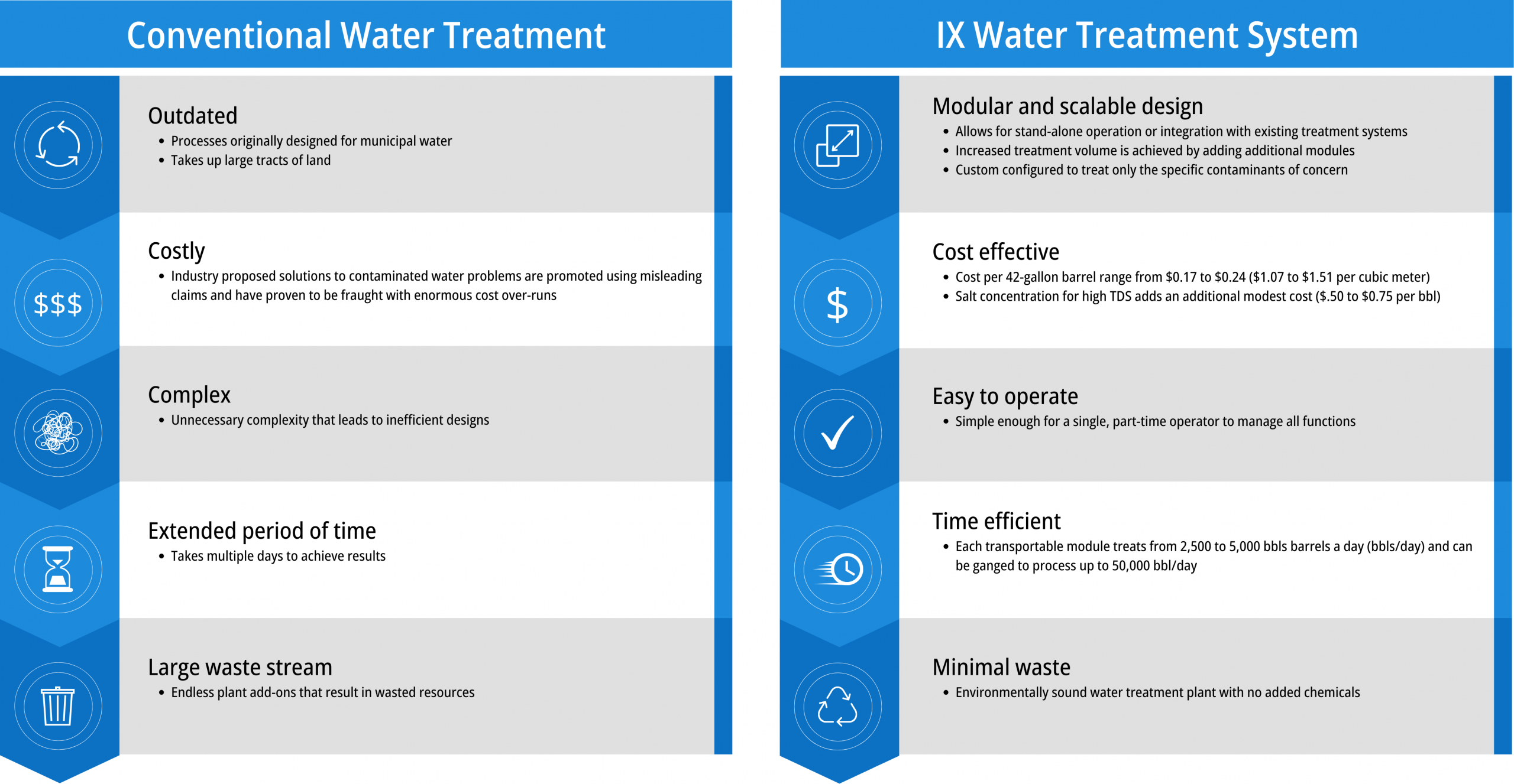 The innovative modular design of IX Water ensures you only pay for what you need—as part of a complete system or integrated with your current treatment train. IX Water technologies are scalable to fit your needs, ranging from modest per day treatment of a few hundred barrels up to 50,000 barrels a day in a single system.