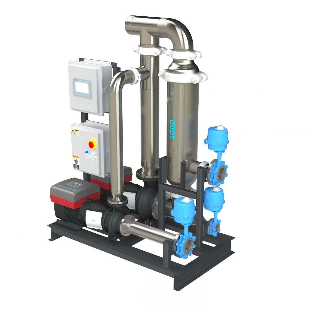 - Pressure-controlled feed-water enters the unit and the water velocity across the filter screen initiates cross-flow filtration.